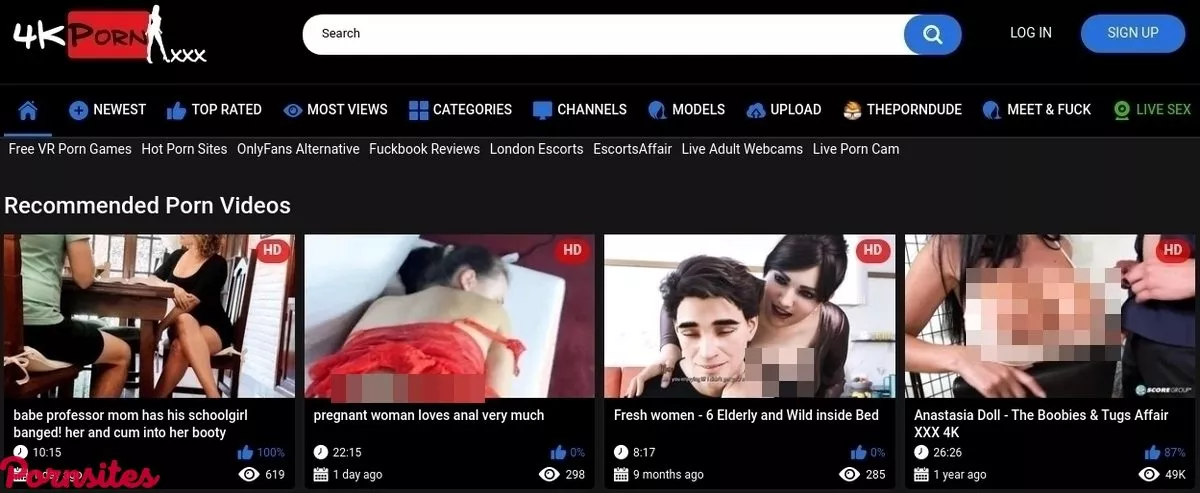 The first thing you will notice when you land on the homepage of 4kPorn is a simple design and a lot of thumbnails that are simply calling you to stay here for a while and explore the site! It is as simple as that, but I want to bring this place closer to you, so let's start from the beginning! In the header, you will see a nice logo which has some red details so you can simply not miss it! Then there is a big search bar where you can search for everything that comes to your mind! I tried "anal" and I was surprised how fast the platform worked and how many search query results I've got! Based on that, I can tell that this feature is implemented well and works really nice! The rest of the header is reserved for the login and sign-in buttons! As I told you already, you don't have to create an account here, but if you want for example to have your personal collection of favorite pornstars, movies, or similar shit on this site, you will have to create an account! The process is really simple and everything is free! Just under the header, you will see a navigation bar with a ton of standard sections when it comes to porn tubes! The first one is Home, then you will see Newest, Top Rated, Most Views, Categories, Channels, Models (this is another feature for which you need to have your account). All in all, nothing new and spectacular, but the most important thing is that all of these sections work fine, nothing is dead, and to be honest, using these shortcuts can save you a lot of time!When it comes to design, it's really simple: