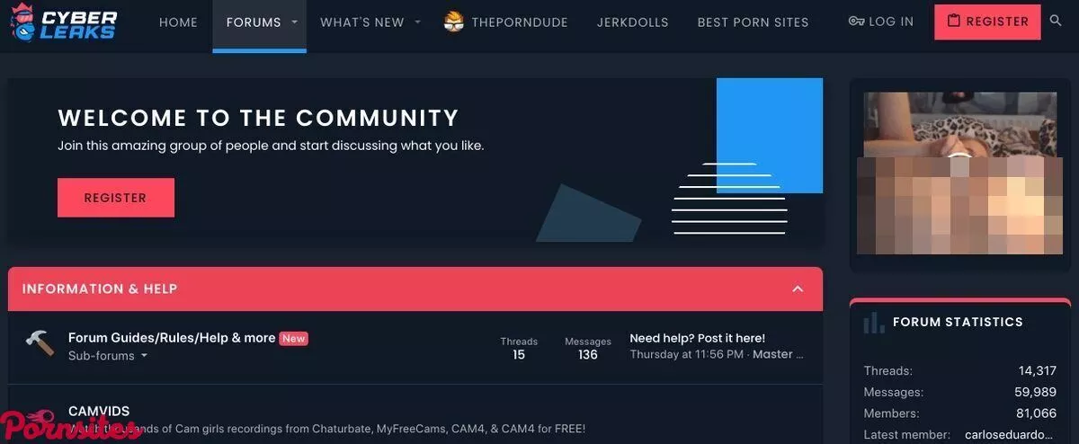 That is on point since Cyber Leaks did make things simple. The website made a Cyber Leaks graphic at the top of the page rather than using a fancy logo. Furthermore, the domain's sole welcome message is a simple banner reading "Welcome to the Community." Join this incredible community of individuals and start talking about what you enjoy. The banner continues. A registration button is located beneath this sentence. Of course, you already know what this button is for, but we'll investigate that further. The header bar also has links to the main page, forums, what's new, login, registration, and the adorable search symbol. When you go to the forum area, you will see sections that split the complete collection. These insightful chapters include Friends, Leaks, Information & Help, and Regular Porn. Conversely, the What's New section highlights the platform's most recent products. Additionally, it divides the information into the most recent activity and new postings.Different Types of Leaked Content