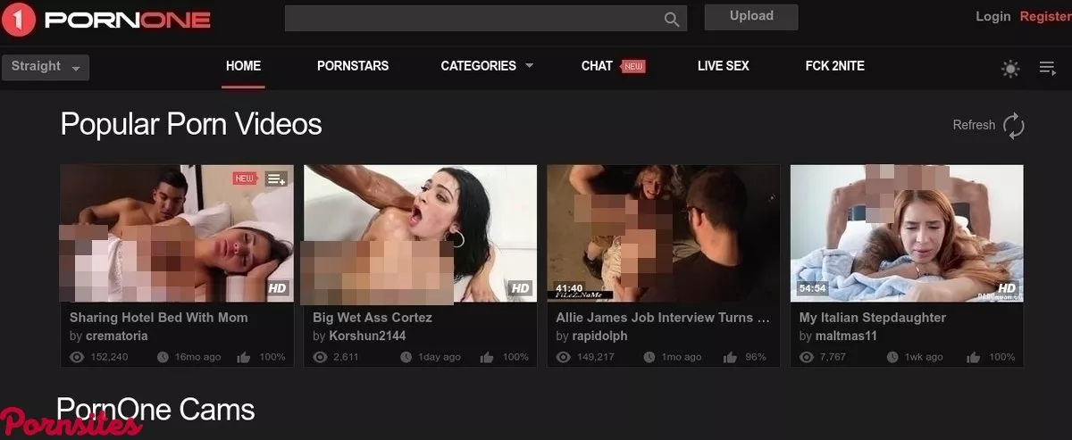 This site has simple looks but it looks more than decent! At the top of the page, you will see a nice header that contains several elements! These elements are the site logo, a simple number 1 in the red circle, and title pornone! Then, in the middle of the page, you will find a big search field, which is well implemented and can be a really helpful tool if you have some specific porn scenes, actors, or studios in mind! Just next to this search field, the guys from PornOne have placed an Upload button, which means everyone can contribute to their already huge database of movies! In order to upload the scenes, you will have to create a free account, and that job tasks take about 30 seconds! In the right-hand corner of the page, you will see register and login options! The second part of the header is reserved for the stuff that can make your stay at PornOne more pleasant! Let's count them all then... First, on the left-hand side, you will see a drop-down menu with options such as Straight, Gay, Shemale, Female! No need to tell you what these options do, right? Then, you have sections such as Home, Pornstars, Categories, Chat, Live Sex, Fck 2Nite! All these are here to make you happy, allow you to spend less time, and find what you are looking for easily and with no effort at all! For Chat, you will also have to create an account! When it comes to LIve sex and Fck 2Nite, these sections will lead you to the partner sites of PornOne, and since that is not the scope here, we will skip them for now! In the continuation of that menu bar, you will see a Sun sign, which allows you to change themes here! You can choose light or dark. I prefer this dark one because it's kinda more suitable for porn sites than the light one! Also, everything is black, red, and white, and that combination works just fine here! The last button you'll see here is the playlists button, and if you want to add videos to your playlists, you will need an account!Everything else is devoted to videos!