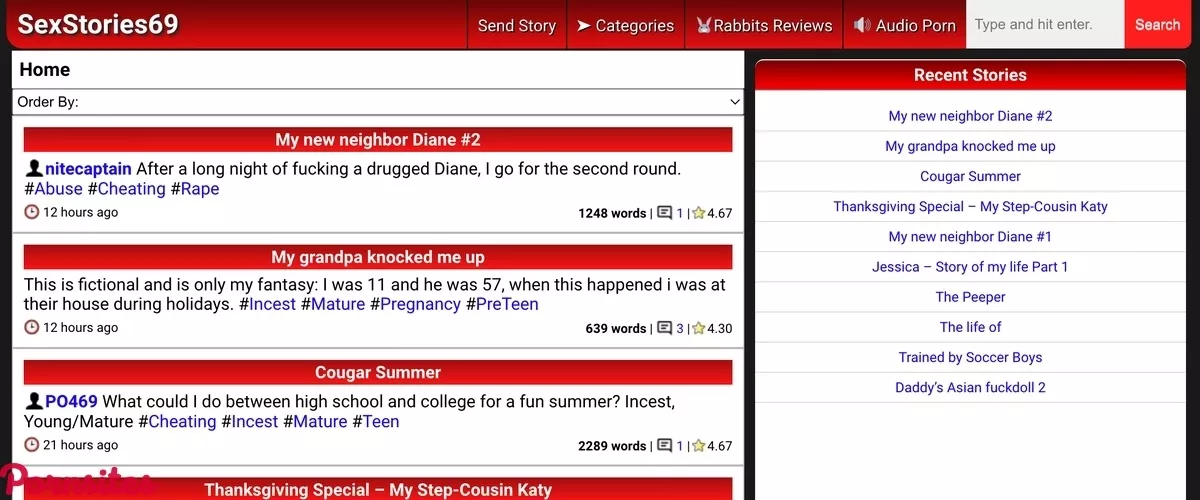 I was rather surprised to see on SexStories69 that all the stories are sorted into categories. Usually, with sites like this one, you can either only scroll through the posts like you can on any sub on Reddit, or they have pages, and that is it. Here, the top of the page holds the categories tab, and there are many more than you would expect. There is a lot of weird shit here, too, so be prepared. People who are into erotica are generally more perverted than your average porn lover. The reason is that they are not limited by fucking laws of physics or anything like that. When you think about it, the only thing holding the writer back is their lack of imagination. Some categories are the usual stuff, teen, threesome, cheating, cuckold, interracial, and lesbian. Something we are used to watching on porn sites with videos. On the other hand, I did promise you weird shit, so don’t be surprised by categories like Rape, Trans, Incest, and Zoophilia. There is something for everyone on SexStories69, but some of the stories might not be your cup of tea. Who knows, maybe by reading a story or two, you decide that some of these fetishes are something you can get to. Try it out and see what makes your dick hard. It is never too late to experiment sexually. Another thing I liked is that each of the stories has tags on them. This way, if you end up reading one on the first page and find that you want it, click on the tag, and you will see all the similar stories. I genuinely emphasize how important it is to find the right smut to jerk off to, and it seems that SexStories69 agrees with me. So for that alone, I think this site has much to like.Wide Range of Kinks and Fetishes Covered