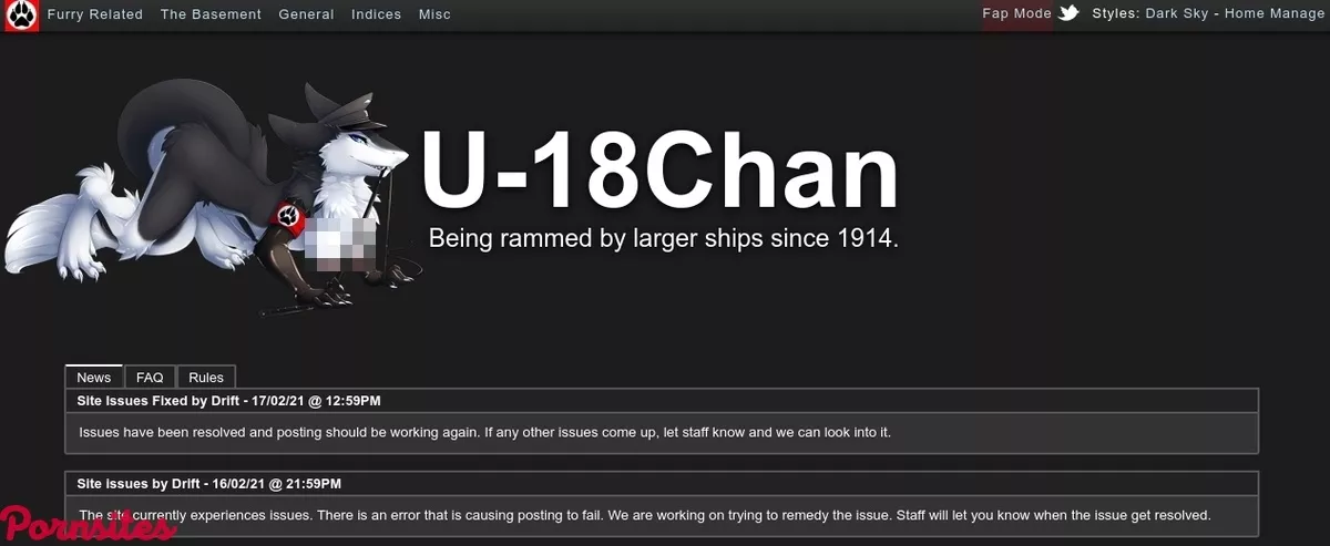 U18Chan.com has its anniversary on the 8th of September, in the year 2010. That's a more specialized way to say it, at least we think so. So, ten years is a lot of time. During this time, they had all the opportunities to gather tons of content and to figure their shit out. So, we at least expect a unique logo, an excellent design, and an effective navigation system. Those are the essential elements that every website should have. They ensure that the user will have a lovely experience while they're browsing this site. We're going to have to be harsh, simply because we think that there are no excuses. Ten years, holy hell! So, let's check all of it out, and then let's see whether it's good or utterly horrible. Right from the start, we can say that the logo isn't unique. At least the part of it that contains U18Chan.com's name. But, the illustration next to it is fascinating. It isn't anything special, but it certainly does gather all the wanted attention. You see, since this is a furry website, their logo is a humanoid animal. But, the attire that said creature is wearing is similar to all the Nazi uniforms back in World War Two. Except that it looks like a, huh, less modest version of it. But, rest assured, the creators of this website do not support Nazis. Instead, they purely chose the uniform because of artistic reasons. They don't hold extreme political opinions. But, we guess we got carried away, so let's keep discussing the design. Aside from that, the rest of the website is merely black. It doesn't have anything else that's unique. But, at least the place looks as simple as it can and looks like it works that way as well. You shouldn't have any problems with your vision as well since the site is stuck permanently in dark mode. You'll enjoy this design for sure, even if it's not the best thing that you've ever seen. The navigation system is also cool as hell. When you first enter U18Chan.com, you're going to see a few things in the middle of this site. Those things have nothing to do with the content. Instead, they are about the legalities, frequently asked questions, and whatnot. They're also about this website's rules. Once you read that, and you respect that, you're ready to go. The content options are at the left top corner of the site. There, you can see all sorts of furry porn. Of course, we won't spoil the surprise, since we're keeping that info until the content section of this review. We can just say that we're pleasantly surprised because the content organization seems to be top-notch. Everything has its division, and you can enjoy these separately for free without any issues.Content of the website